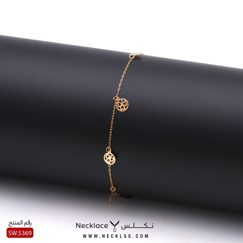 أسوارة ذهب عيار 18 من متجر نكلس، بتصميم بسيط وأنيق يضم سلسلة ذهبية خفيفة مع ثلاث دوائر ذهبية صغيرة بتصميم مثقب. مثالية كـ كَهْدِيَّة ذهبية للمناسبات أو للإطلالة اليومية.