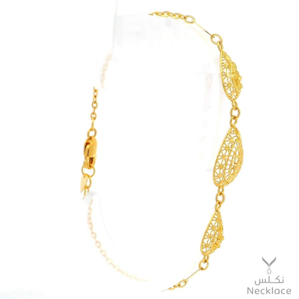 سوار ذهب بتصميم أنيق. مصنوع من الذهب الأصفر عيار 21 ، يتميز بسلسلة رقيقة مزينة بثلاثة دلايات على شكل دمعة مزخرفة بنقوش ذهبية رائعة. يضيف لمسة من الفخامة والجمال إلى أي إطلالة.