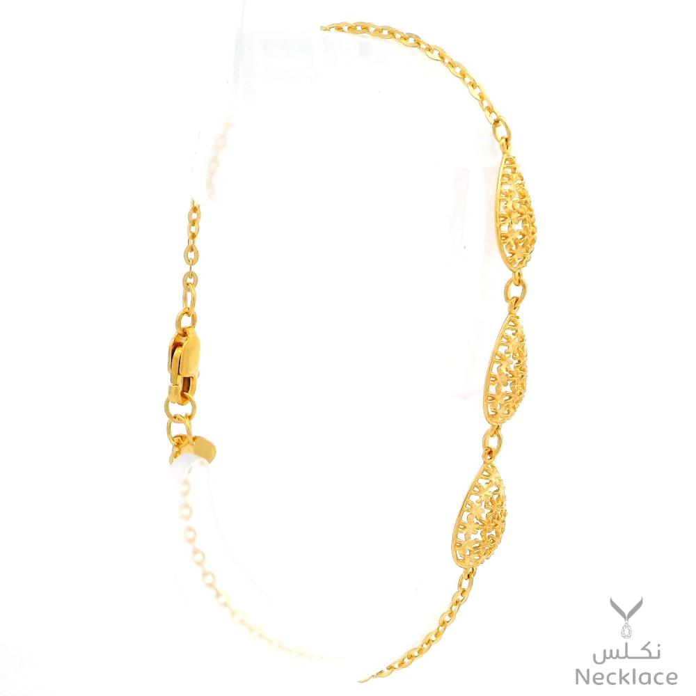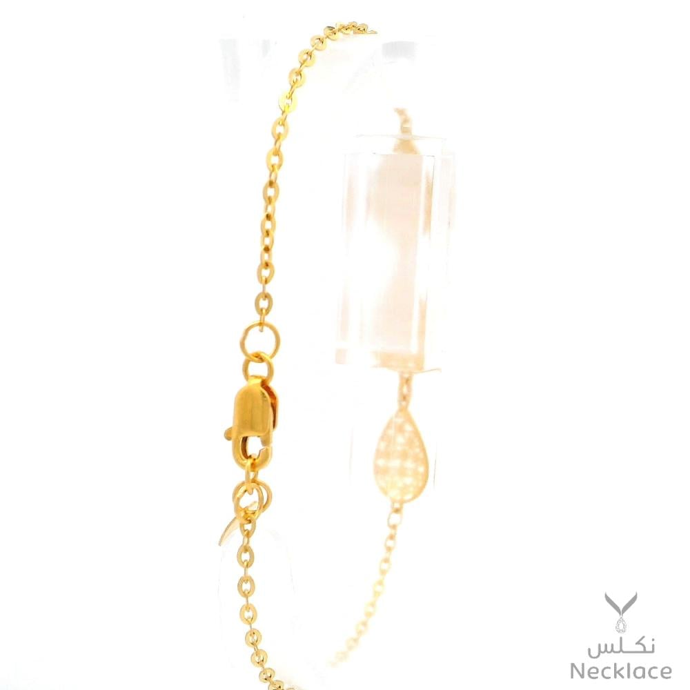 تألقي بأناقة مع هذا السوار الذهبي الرائع. يتميز هذا السوار بتصميم سلسلة ذهبية أنيقة بثلاث دلايات ذهبية بشكل دمعه عيار 21 قيراط، مما يجعله قطعة مجوهرات مثالية لإضافة لمسة من الرقي إلى أي مظهر. مثالي للمرأة العصرية التي تبحث عن الأناقة الخالدة.