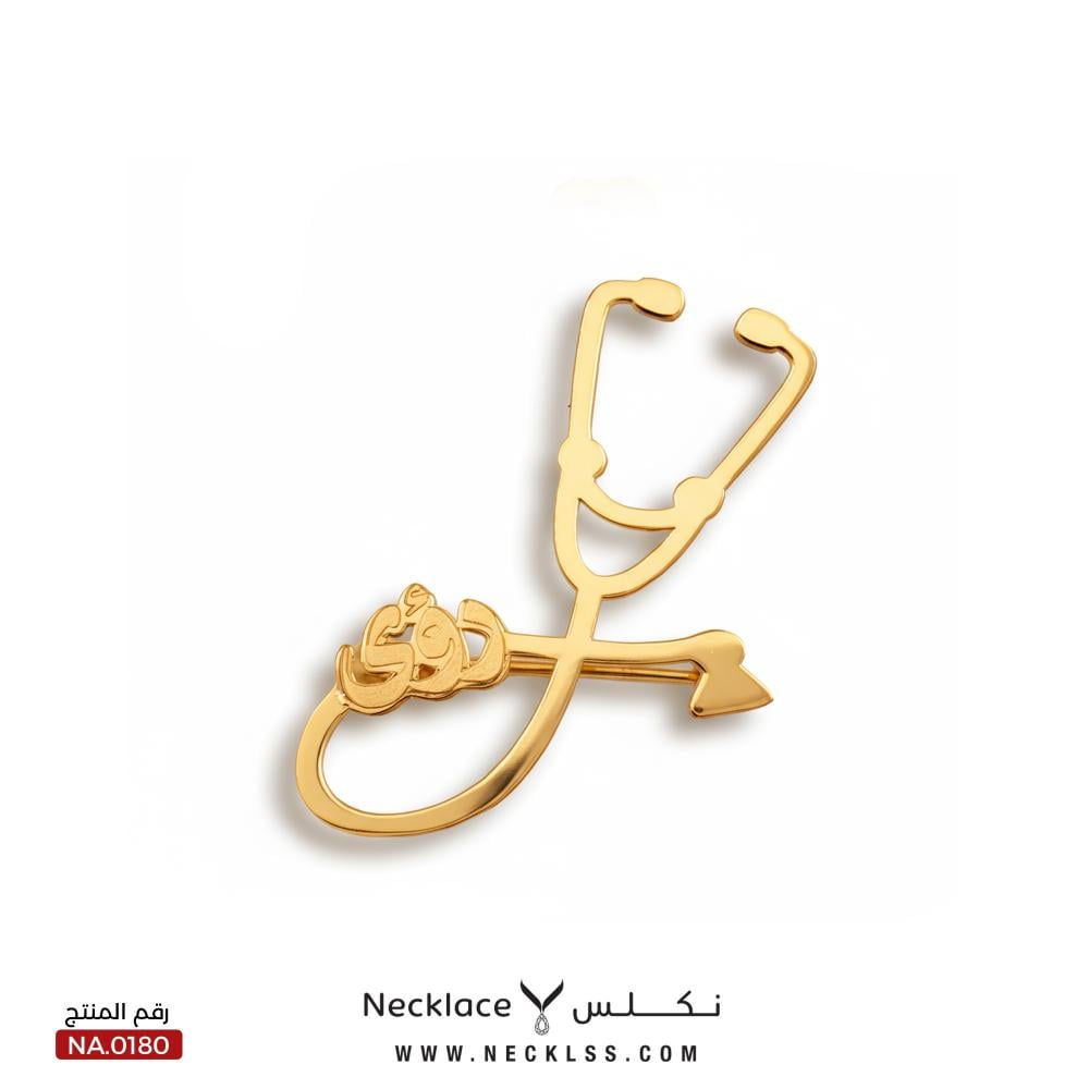 بروش نكلس الذهبي يحمل اسم بخط أنيق، لمسة من الصفاء والرقي، وكأن الاسم يضيء من الداخل. تصميم يعبّر عن التميّز، الأنوثة، والهوية…