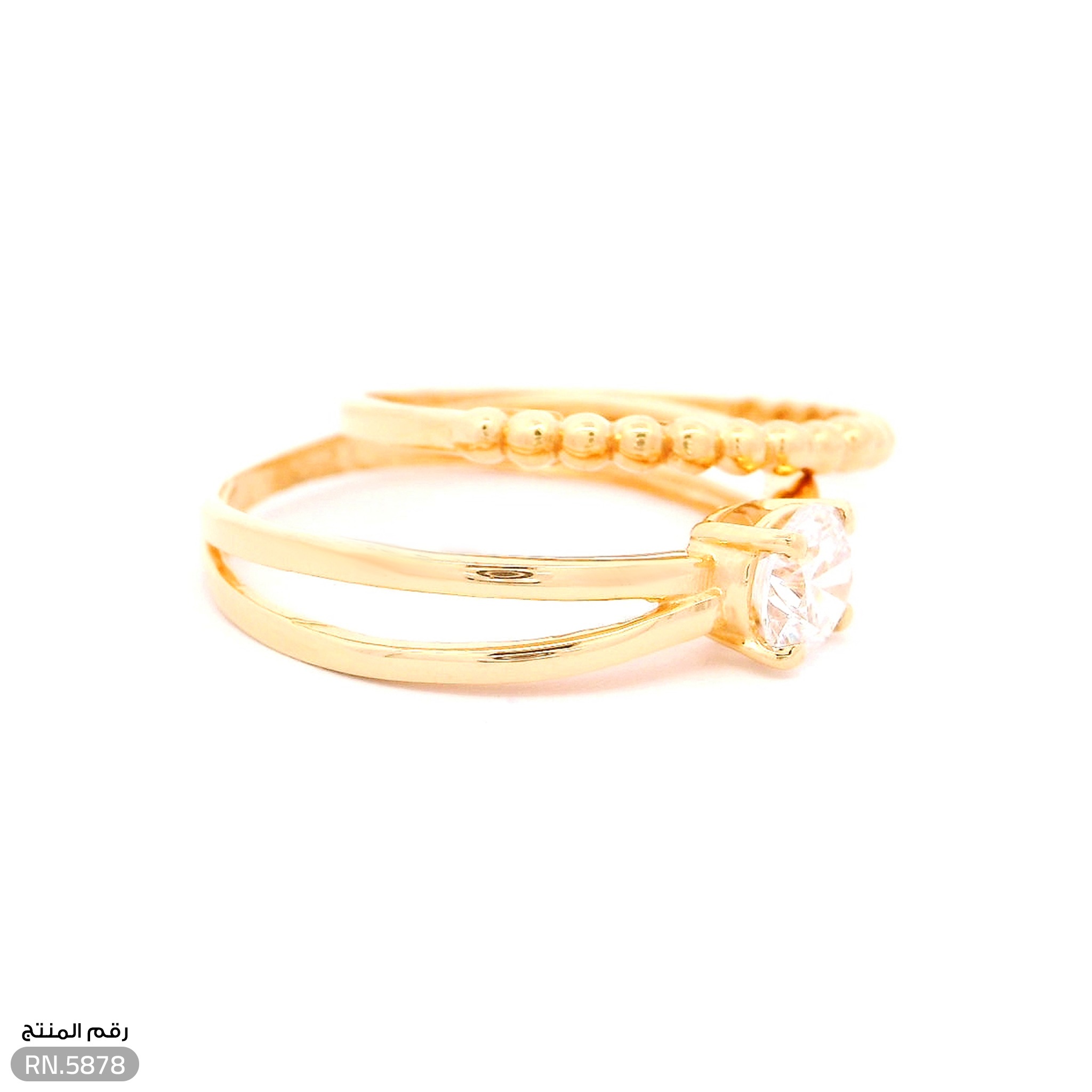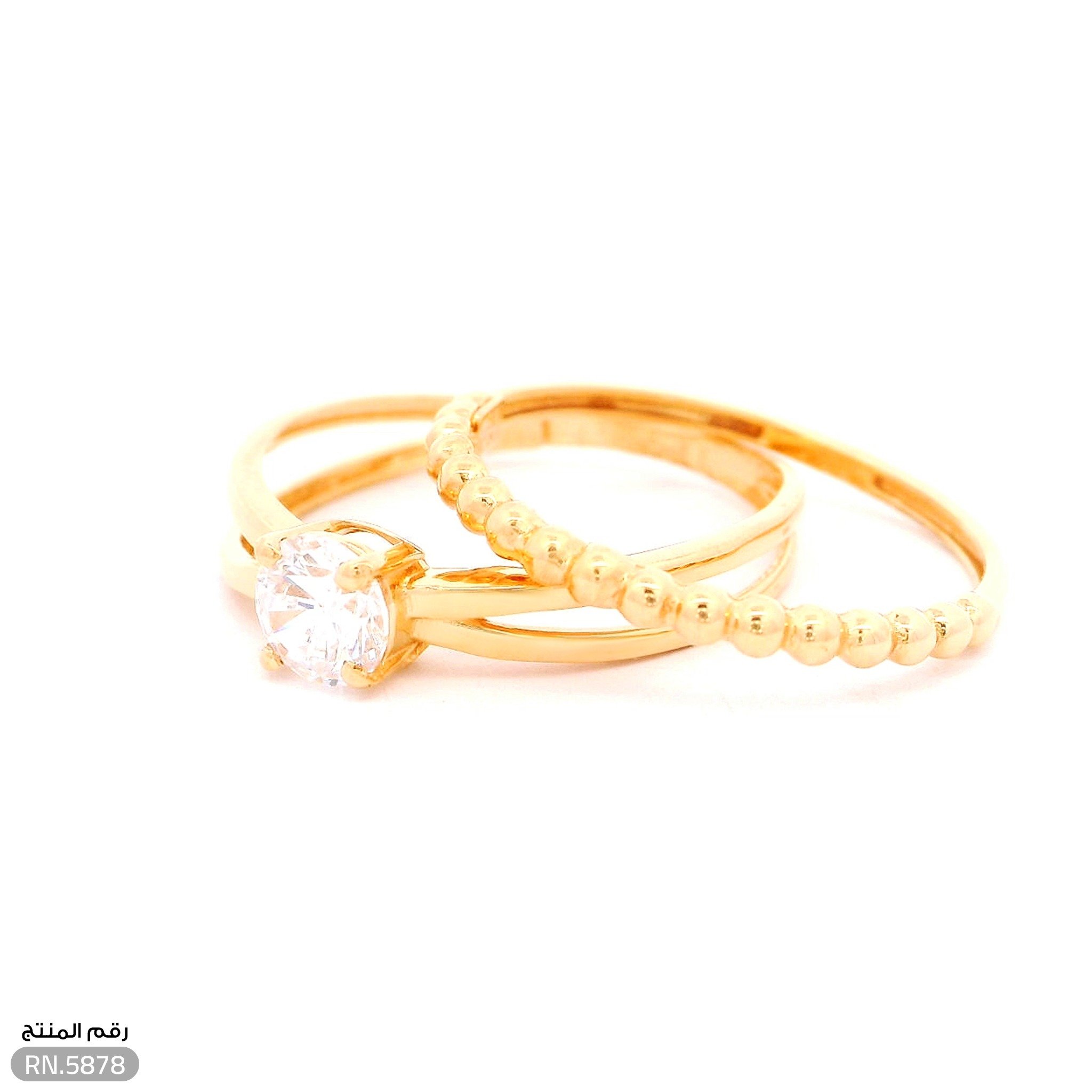 - تناغم المحبس والسوليتير: يتألف التوينز من خاتمين يكملان بعضهما ببراعة؛ أحدهما محبس ناعم مزين بحبيبات الذهب الكروية، والآخر يتوسطه فص "سوليتير" براق، مما يمنحكِ إطلالة متكاملة وراقية.