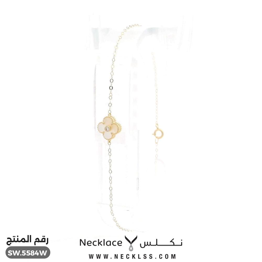 تألقي بجمال سوار الذهب الخالص من نكلس ، المصممة بذهب أصفر عيار ١٨ قيراط. تتألق السلسلة بزهرة البرسيم البيضاء العاجية المرصعة بقطعة زيركون برا...