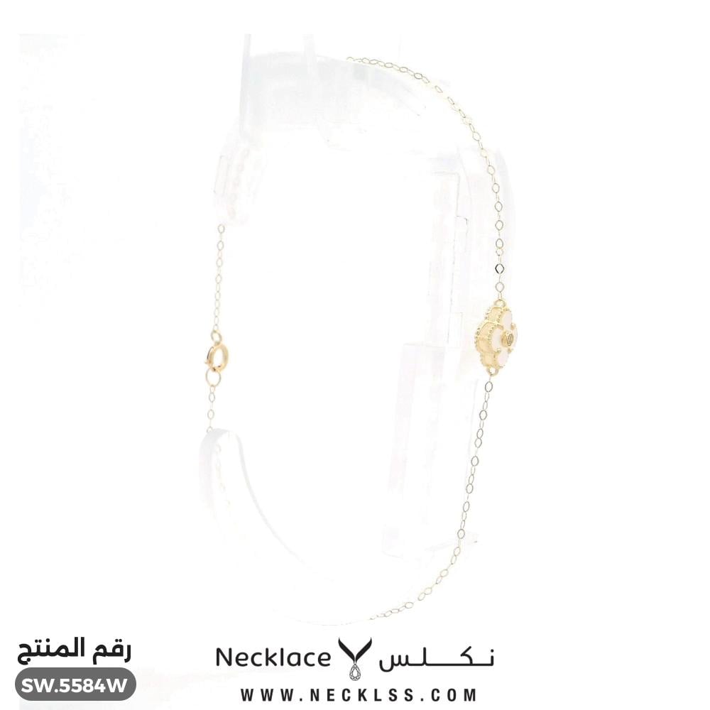 تألقي بجمال سوار الذهب الخالص من نكلس ، المصممة بذهب أصفر عيار ١٨ قيراط. تتألق السلسلة بزهرة البرسيم البيضاء العاجية المرصعة بقطعة زيركون براق دائري، مما يضفي عليها لمسة من الرقي والجمال. مثالية للمرأة التي تبحث عن قطعة مجوهرات أنيقة وبسيطة لتكمل إطلالتها اليومية.