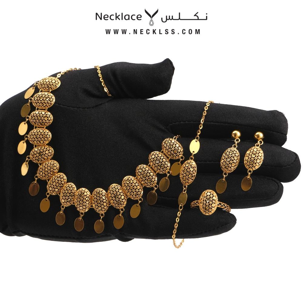 طقم من الذهب الأصفر اللامع عيار 21 / 21K . في نكلس للذهب و المجوهرات نهتم بأدق التفاصيل و نواكب الموضة الأشكال المطلوبة ونوفرها لكم على طبق من ذهب.