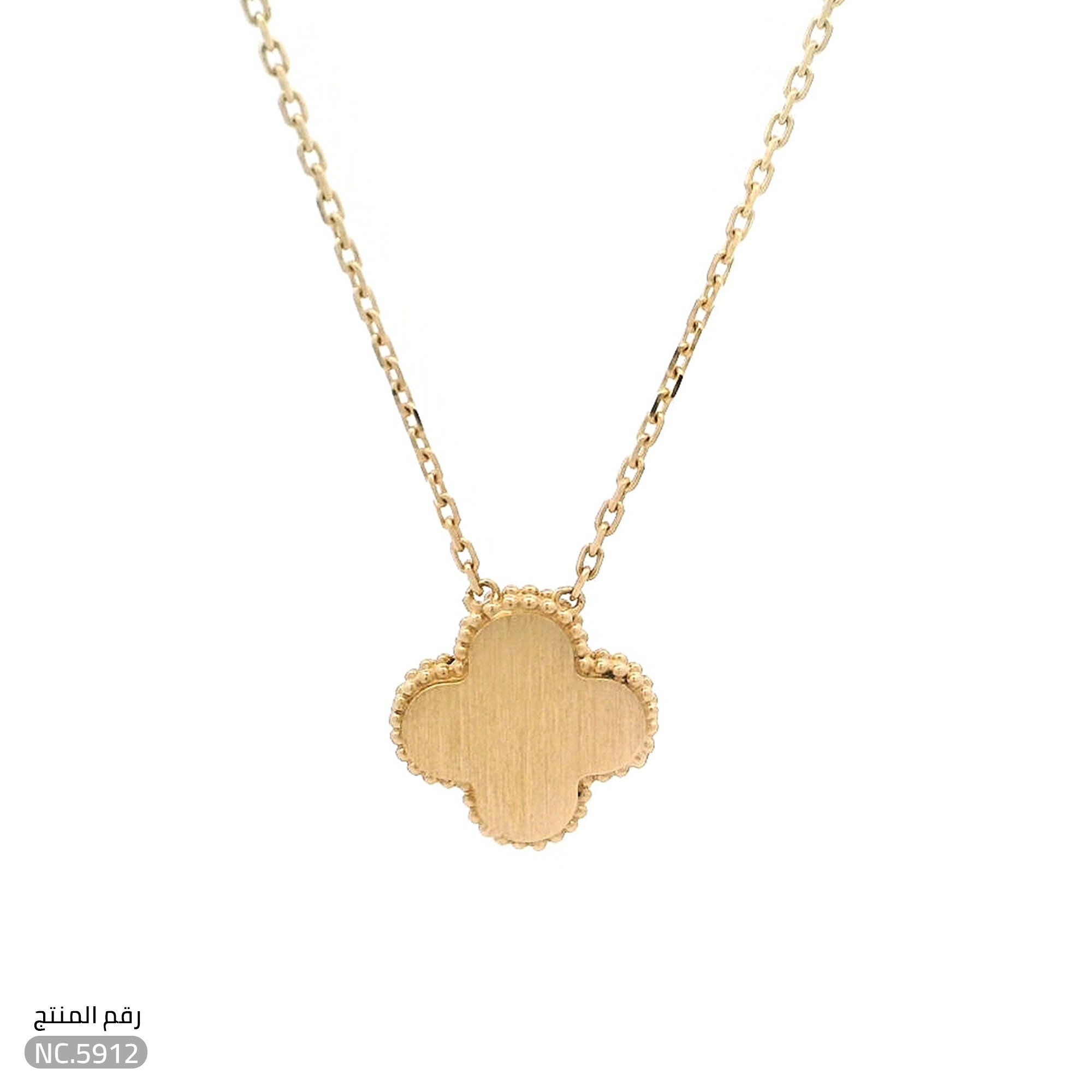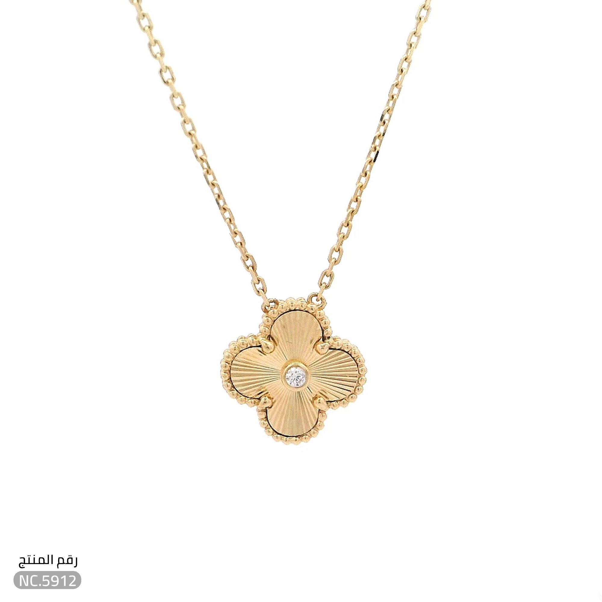 قلادة ذهبية عيار 18من نكلس للذهب والمجوهرات والفضة بتصميم أنثوي أنيق يجمع بين الرقي والنعومة، حيث تتوسطها تعليقة بشكل وردة رباعية الأوراق بتفاصيل منقوشة وحواف مز...