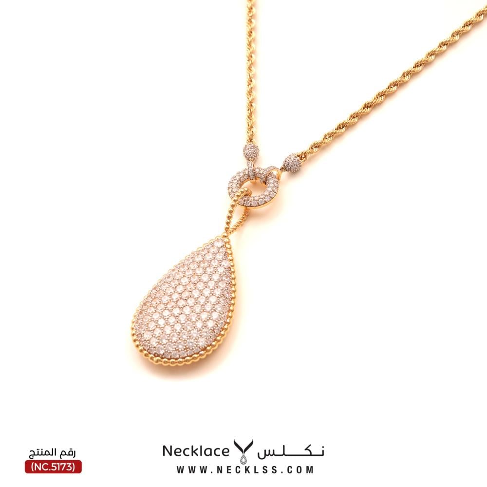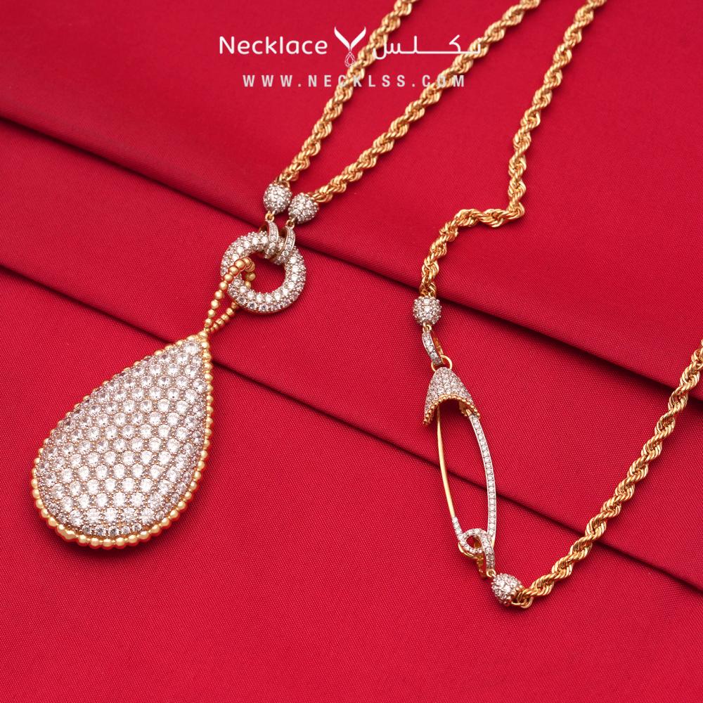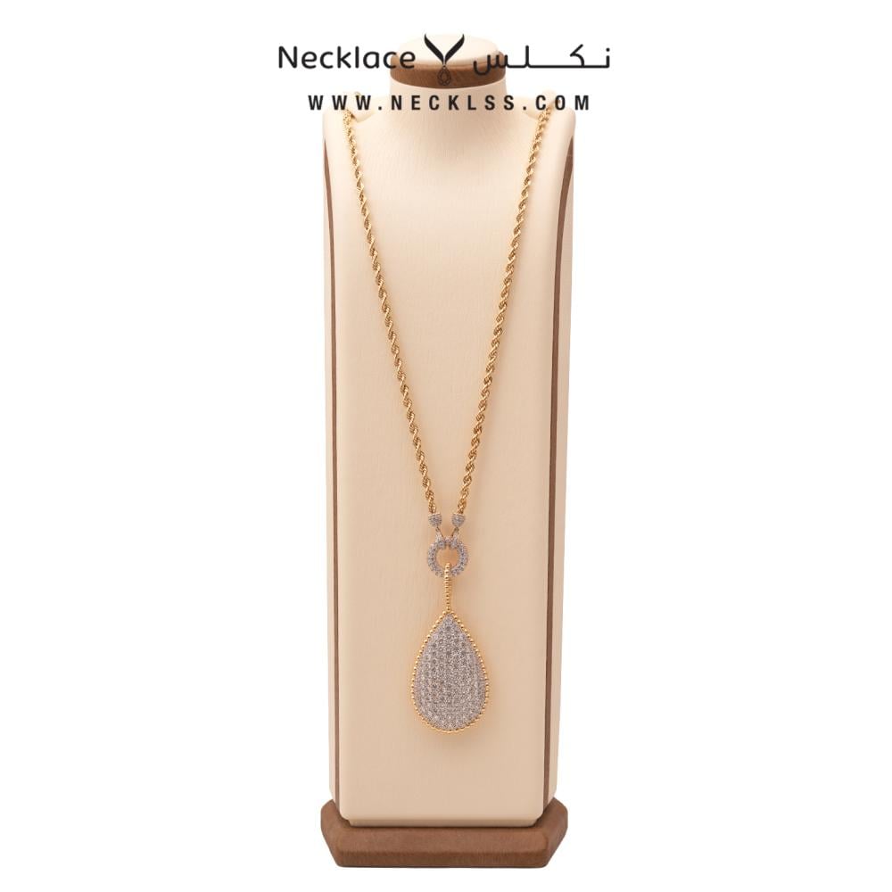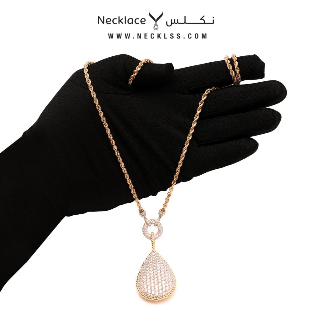 بتصميم فاخر، تتميز بسلسلة ذهبية خفيفة وتدلية قطرية مزخرفة بفصوص بأسلوب متميز. مثالية لـ الإطلالة اليومية أو المناسبات الخاصة.