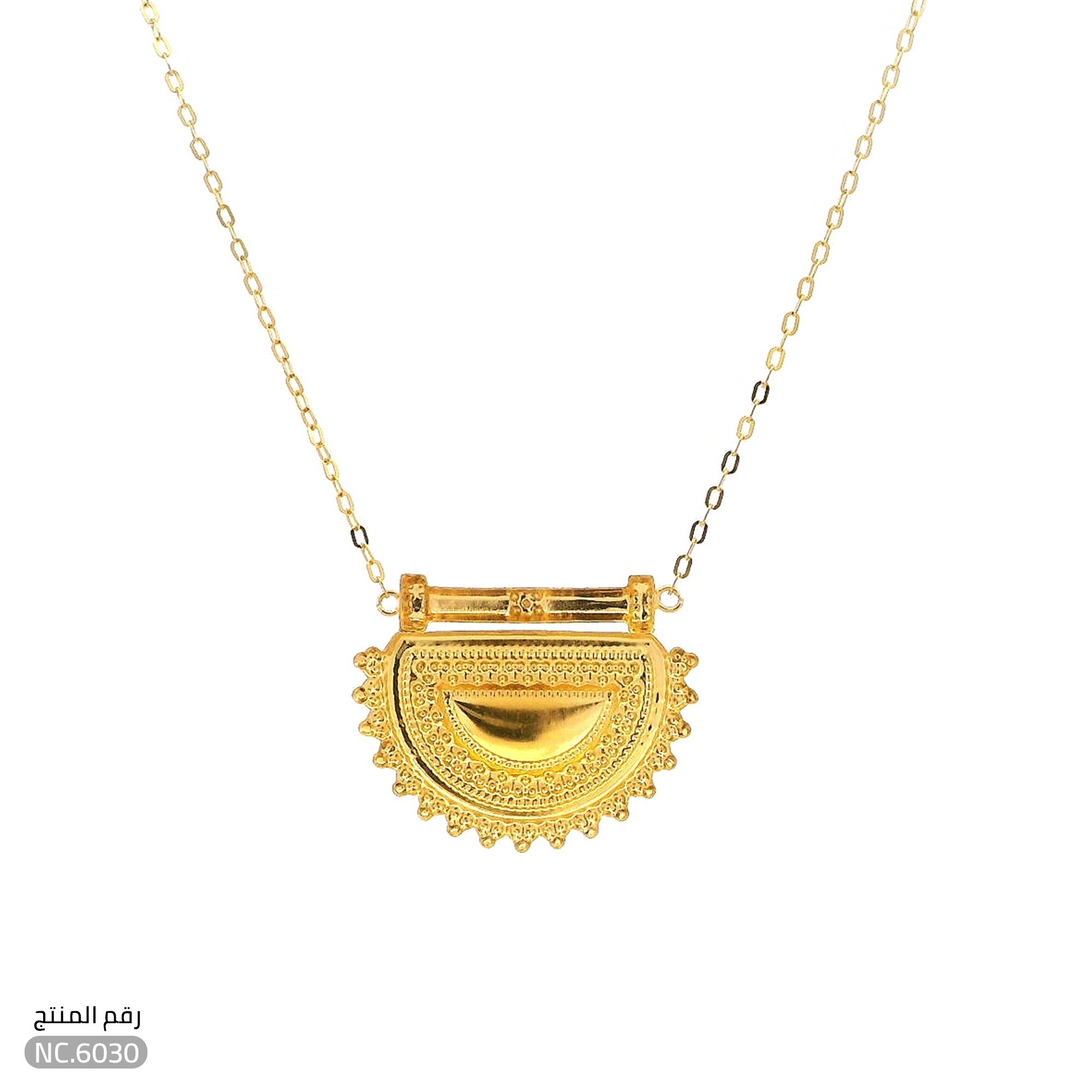 أضف لمجموعتك من المجوهرات لمسة تحمل عبق التراث مع قلادة ذهبية أصيلة عيار 21 من نكلس للذهب والمجوهرات. صُممت هذه القلادة بعناية لتعكس رموز الضوء والحماية، حيث تتو...