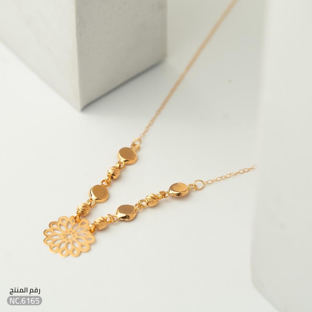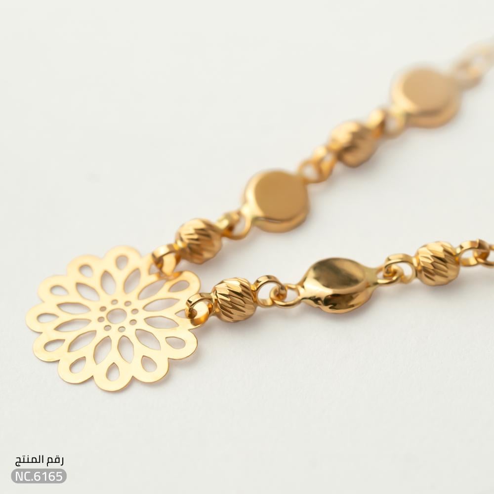 الزهرة الذهبية تتوسط السلسلة بتفاصيل هندسية متقنة وفتحات تضفي عليها إشراقًا وخفة، بينما تضيف الخرزات الجانبية لمسة من الحركة والأناقة المتوازنة. مصنوعة من ذهب عيار 21 لتمنحك لمعانًا دافئًا وجودة تدوم طويلاً، لتواكبي أحدث صيحات المجوهرات الذهبية.