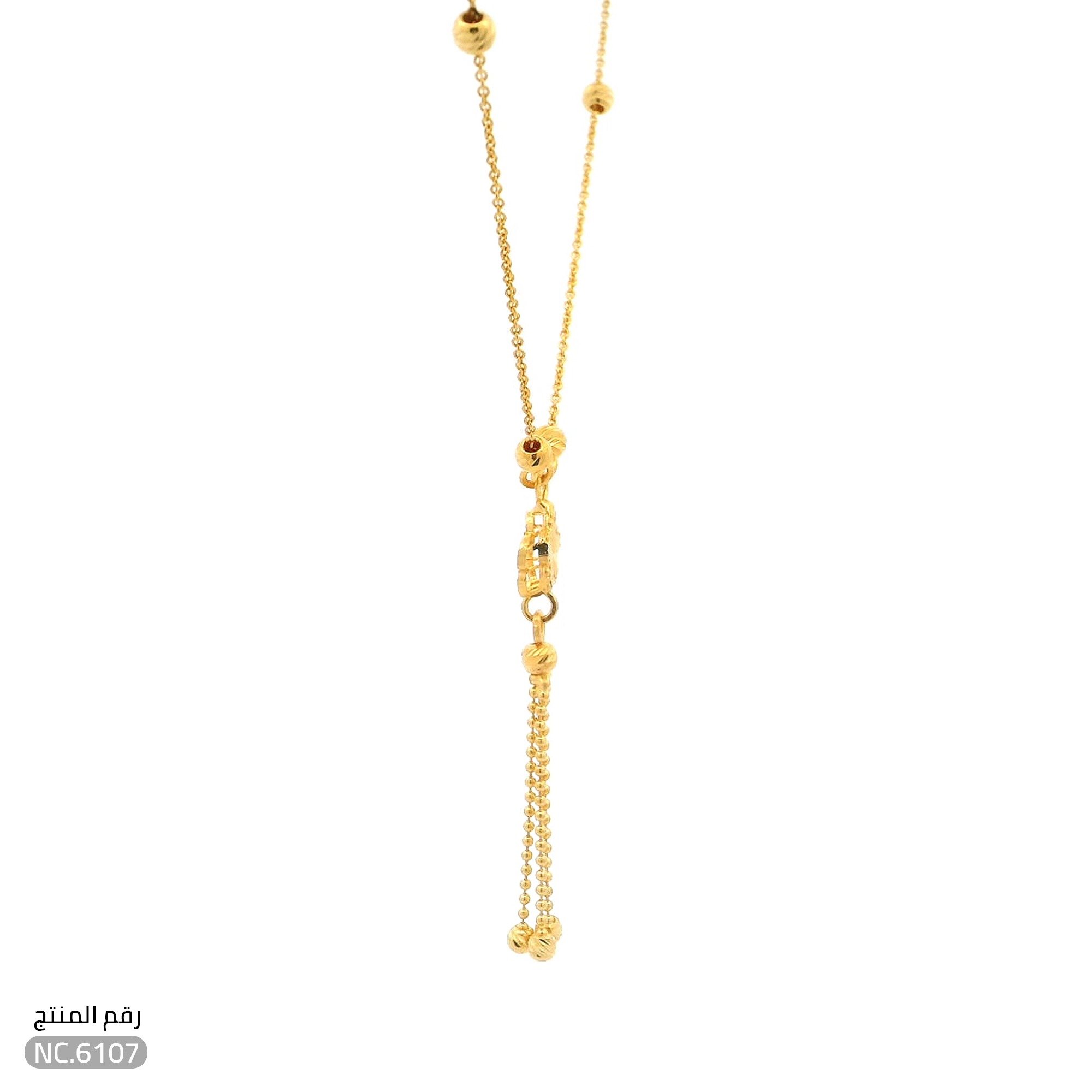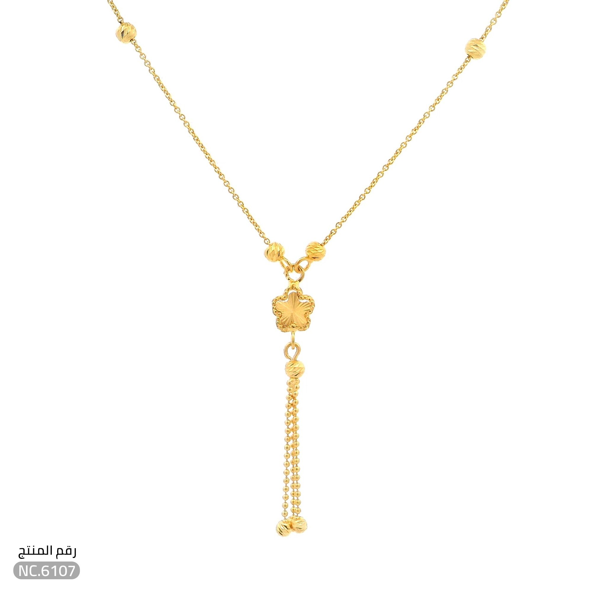 قلادة نكلس ذهب عيار 21 بتصميم فاخر تجمع بين الطابع الكلاسيكي ودقة التفاصيل الذهبية المصاغة بعناية. تتزين القلادة بتعليقة على شكل زهرة ذهبية تتدلى منها سلاسل رفيعة تنتهي بكرات ذهبية صغيرة، مما يضفي على القطعة حركة رقيقة ولمعاناً يجذب الأنظار. توازن التصميم يجعلها خيارًا مثاليًا لكل من ترغب في إضافة لمسة أنثوية راقية إلى إطلالتها اليومية أو لمناسباتها الخاصة.