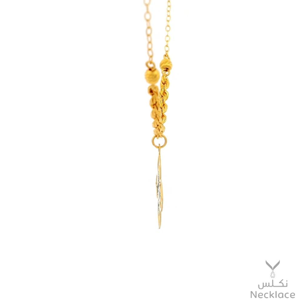 تألقي بجمال خالد مع هذا العقد الساحر، المصنوع من الذهب الأصفر عيار 21 قيراط. يتميز بتعليقة زهرة أنيقة مرصعة بزيركون أخضر بقطع كابوشون، يتميز بزيركون بلون أخضر عميق ولمعان طبيعي. هذا العقد هو إضافة مثالية لمجموعة مجوهراتك، سيضفي لمسة من الرقي والأناقة على أي إطلالة.