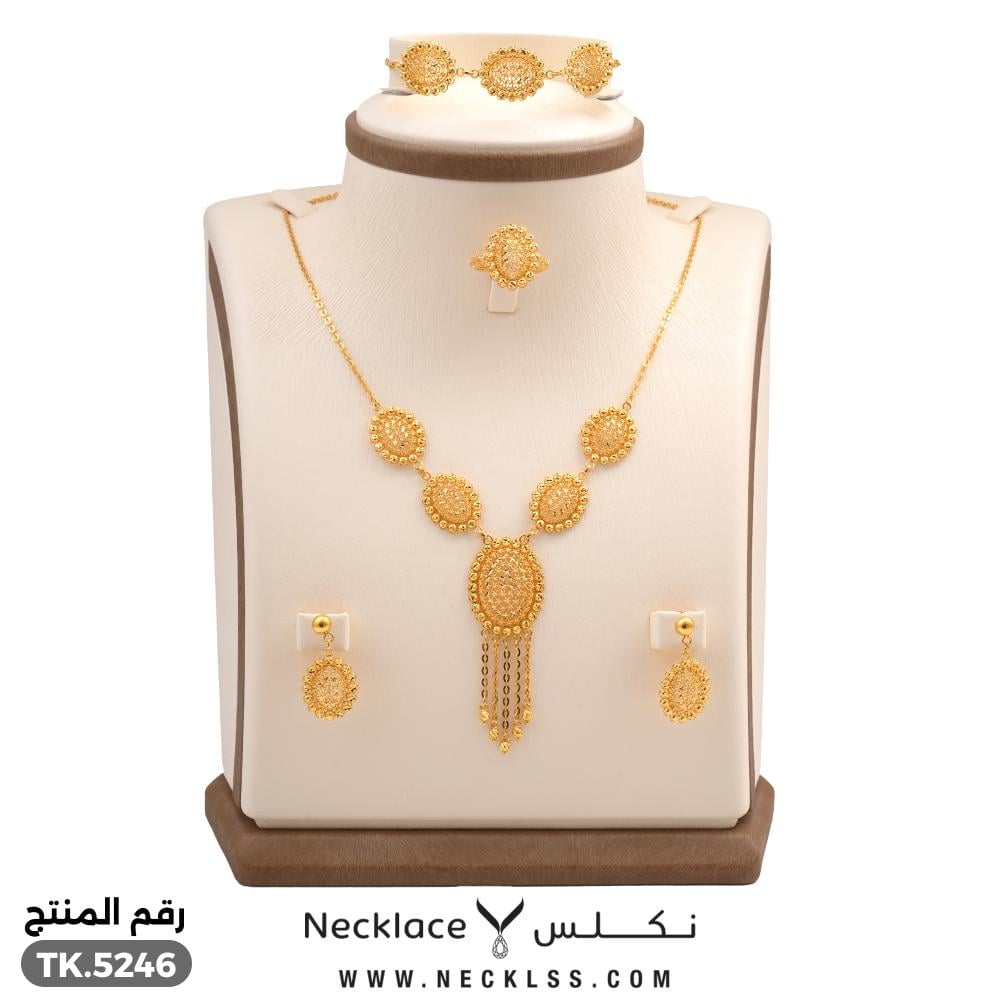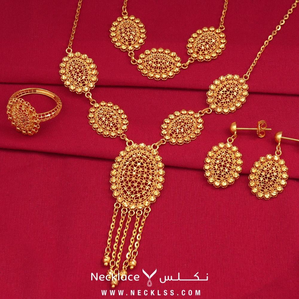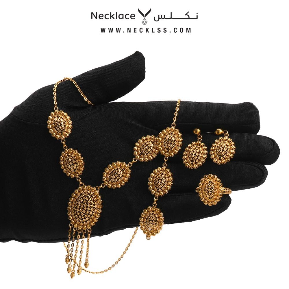 طقم من الذهب الأصفر اللامع عيار 21 / 21K . في نكلس للذهب و المجوهرات نهتم بأدق التفاصيل و نواكب الموضة الأشكال المطلوبة ونوفرها لكم على طبق من ذهب.