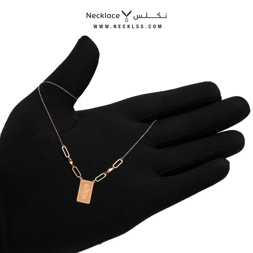 تألقي مع قلادة ذهب بتصميم مستطيل محفور من نكلس، قطعة فريدة تجمع بين الأناقة والفن في تفاصيلها الدقيقة. يتوسط القلاد...