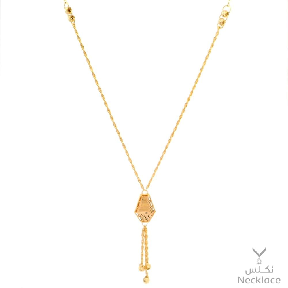 اكتشفي سحر الأناقة مع هذا العقد الرائع المصنوع من الذهب الأصفر الخالص. يتميز هذا العقد بتصميم سلسلة ملتفة فريد وتعليقة جذابة تتدلى منها سلاسل ذهبية مزينة بكرات ذهبية لامعة، مما يضفي لمسة من الفخامة والجاذبية على إطلالتك.
